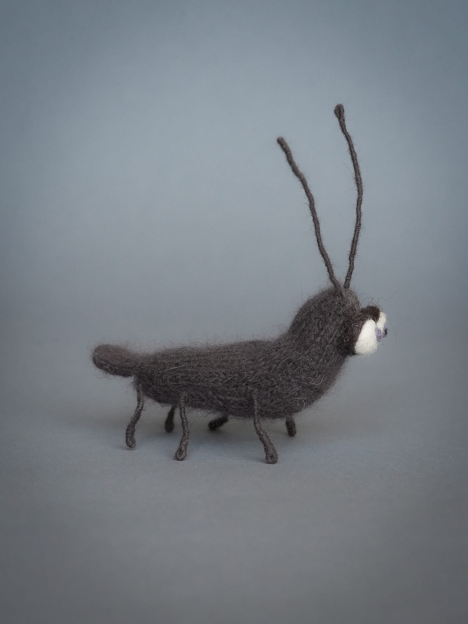 Выполнен в смешанной технике — вязание спицами и валяние.