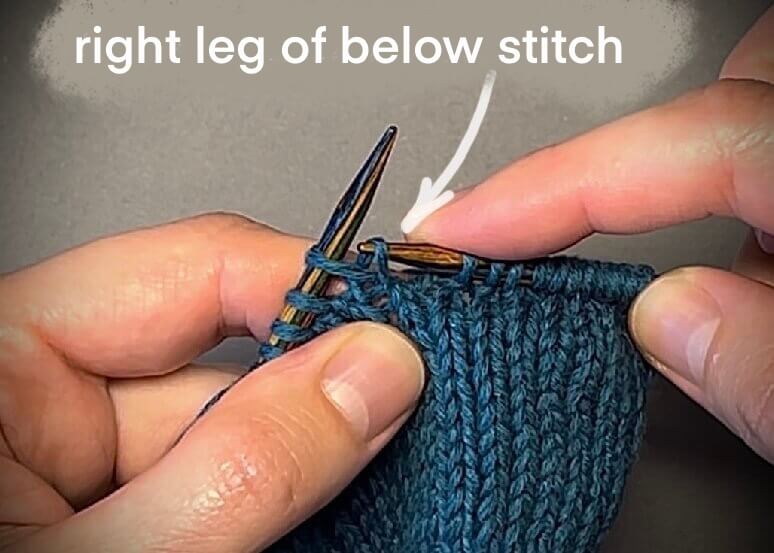 Insert the right needle under the right leg of the stitch from the previous row as if to knit and knit it.