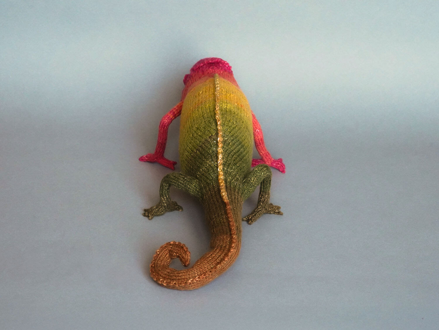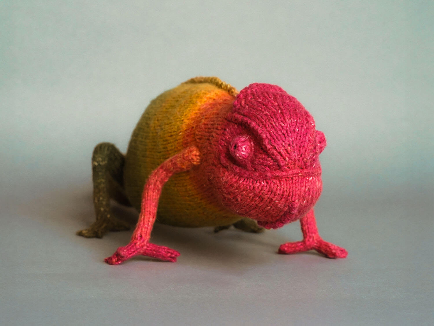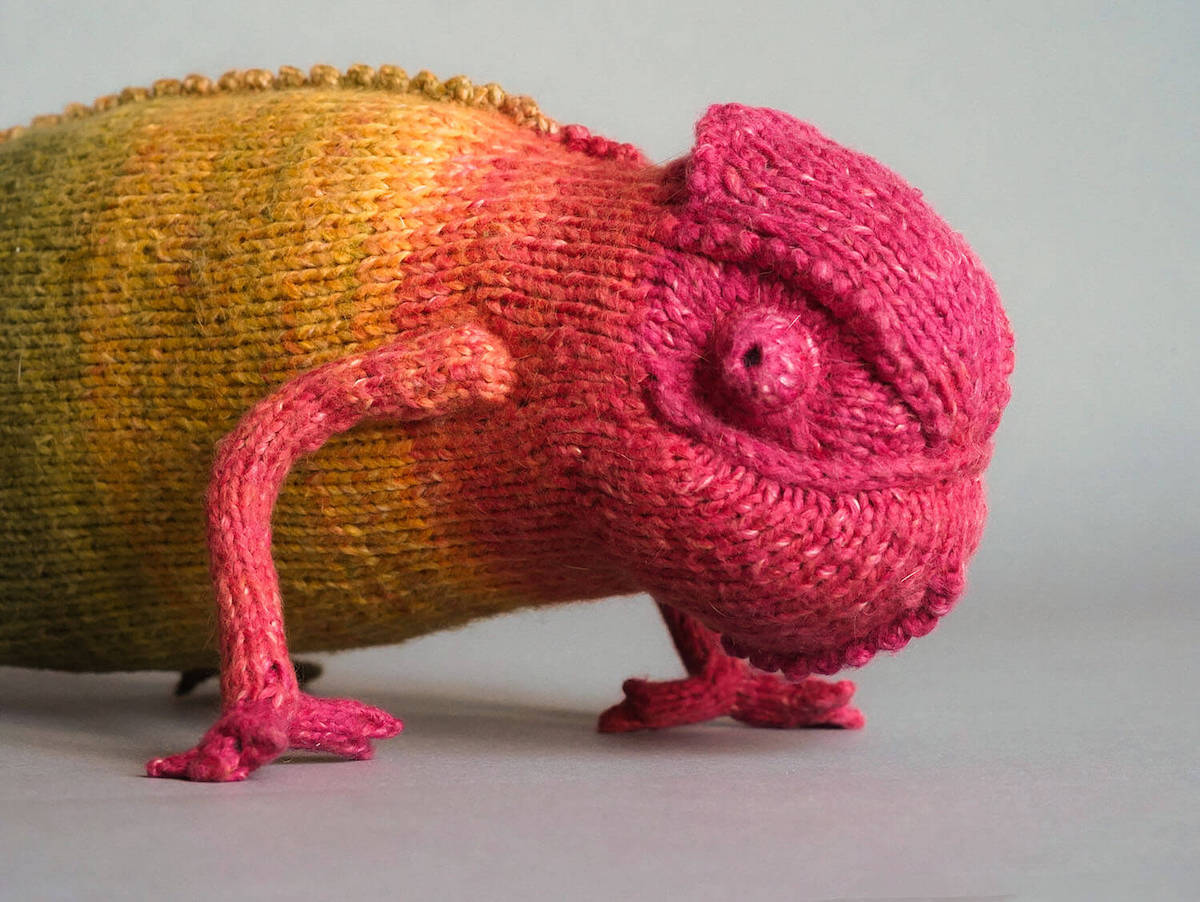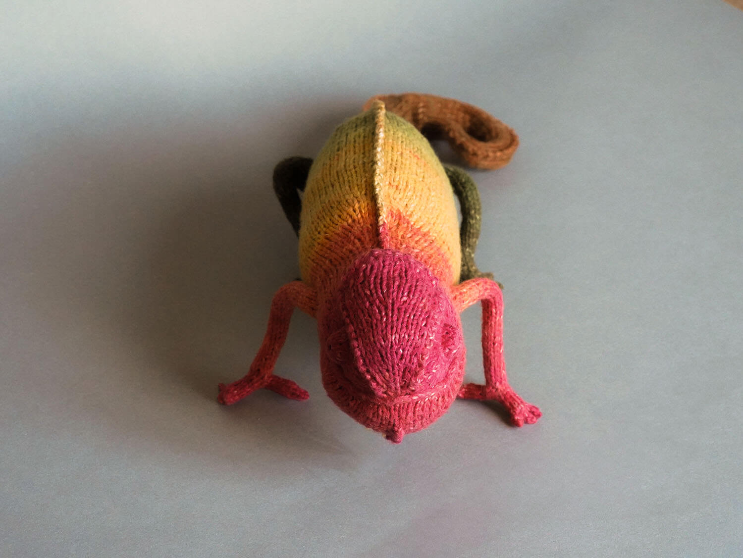 Knitted Chameleon Rain B. Ow — a one-of-a-kind handmade toy with a playful soul and magical charm.
