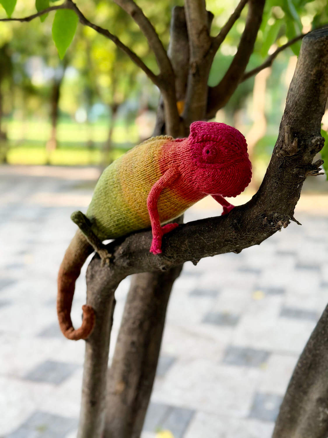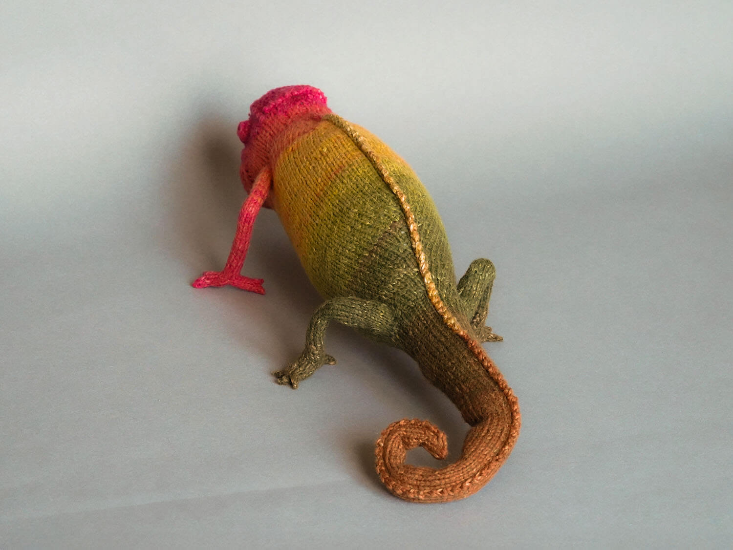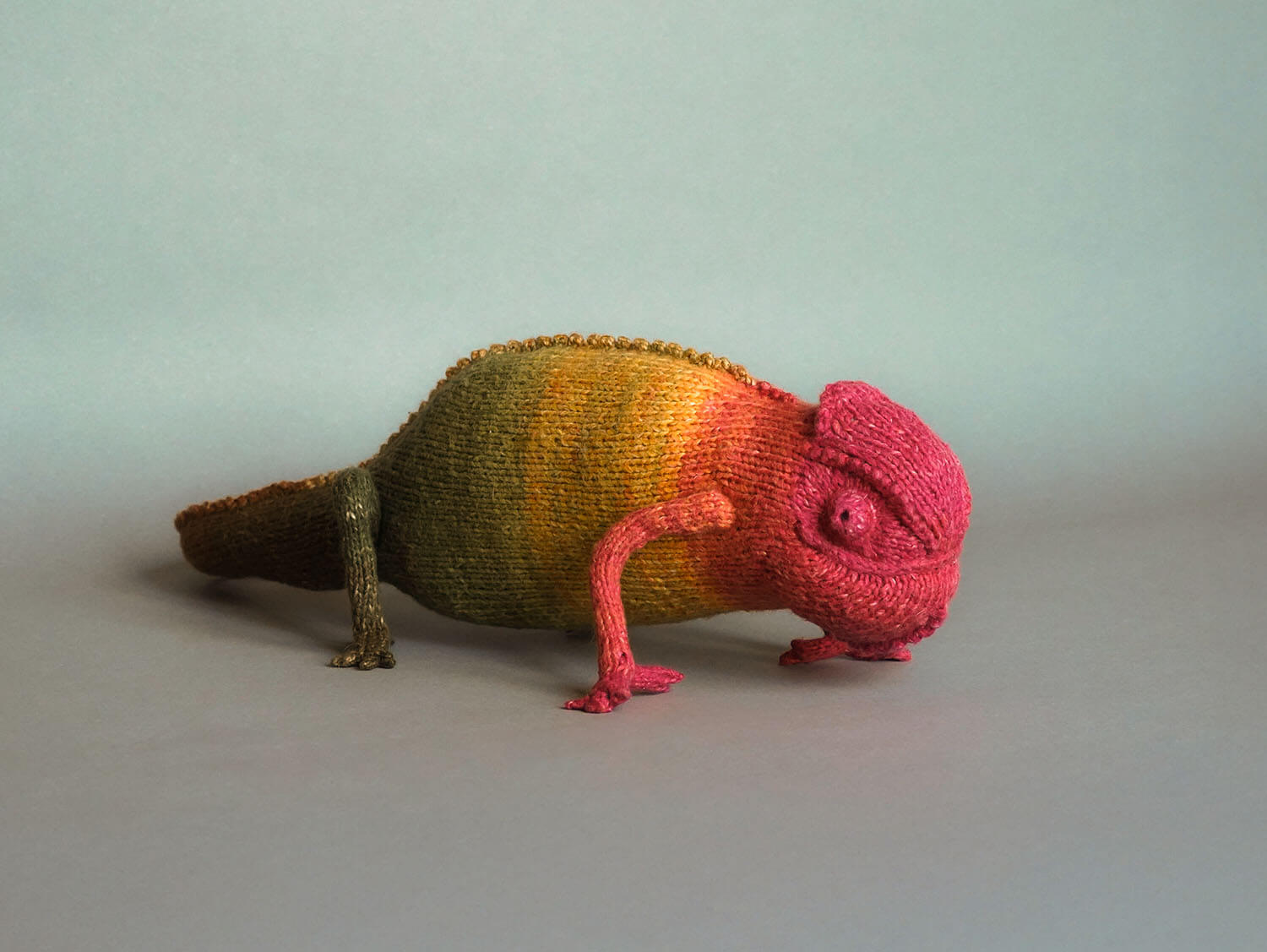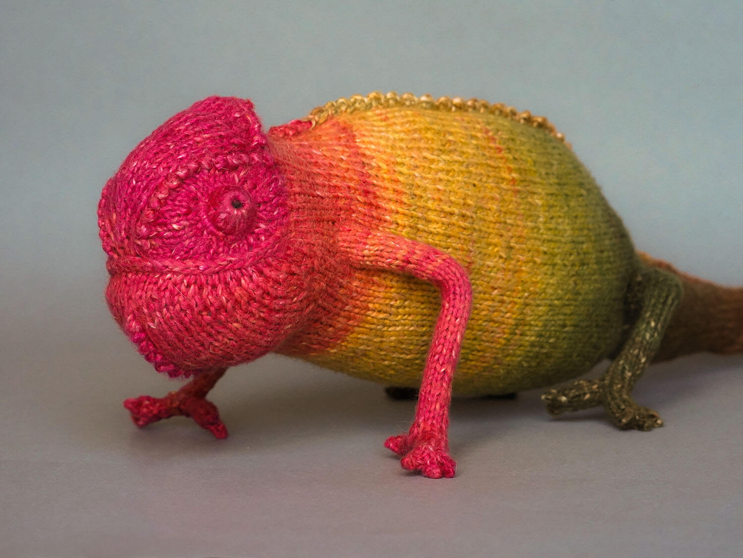 Knitted Chameleon Rain B. Ow — a one-of-a-kind handmade toy with a playful soul and magical charm.