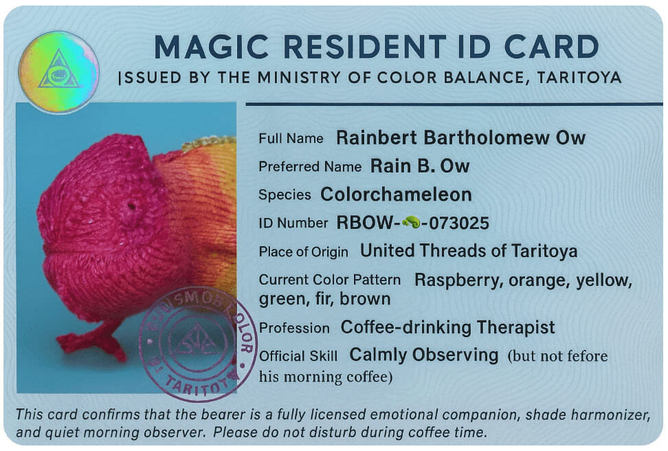 Yes, that’s his real name. He even has an ID, a library card, and a favorite spot on the terrace. His full name? Rainbert Bartholomew Ow. Yes, a bit much. That’s why his friends just call him Vasenka. He is a knitted chameleon.