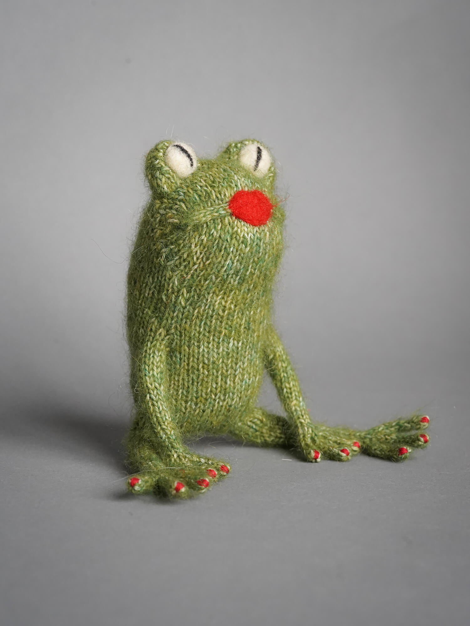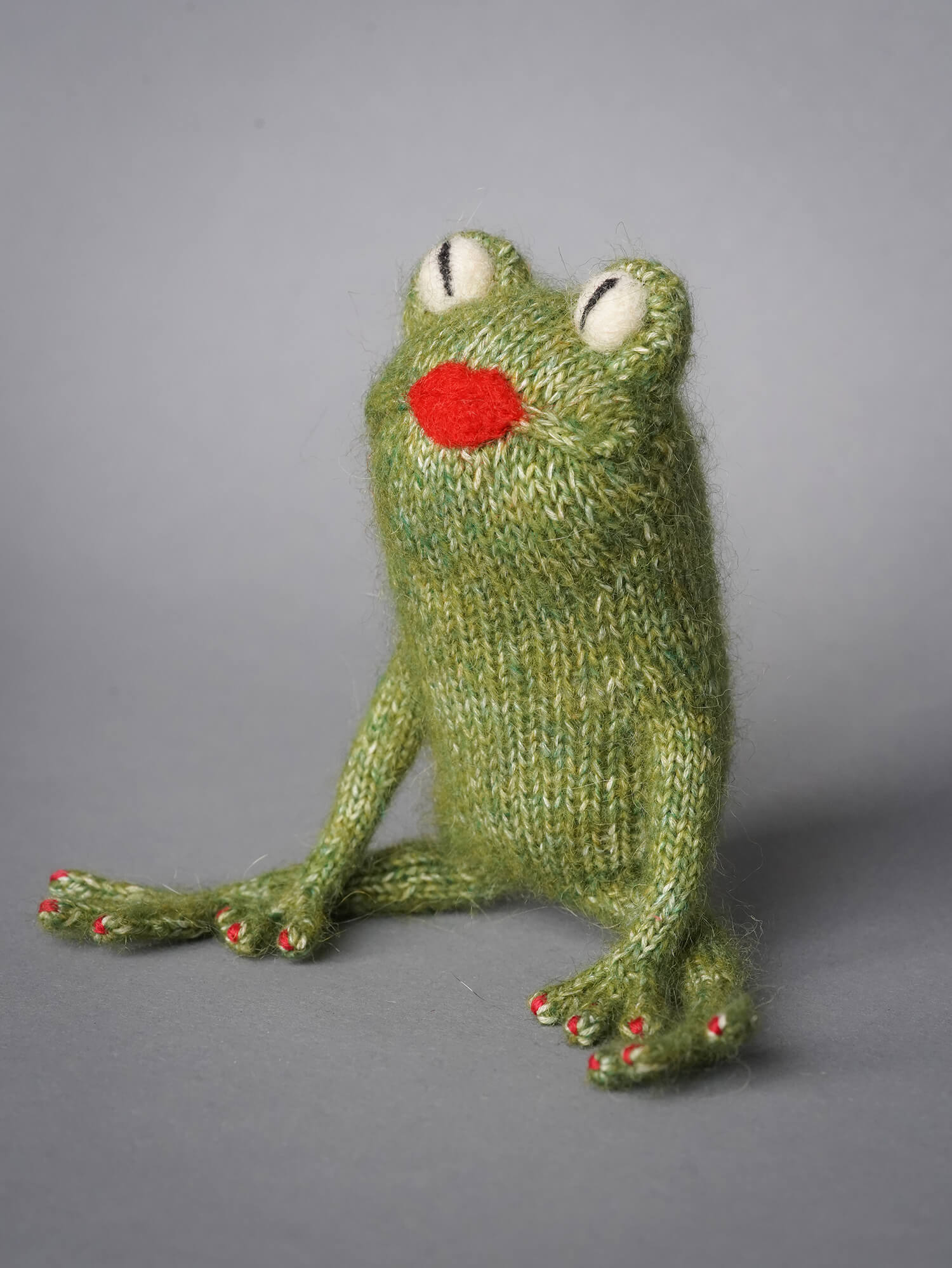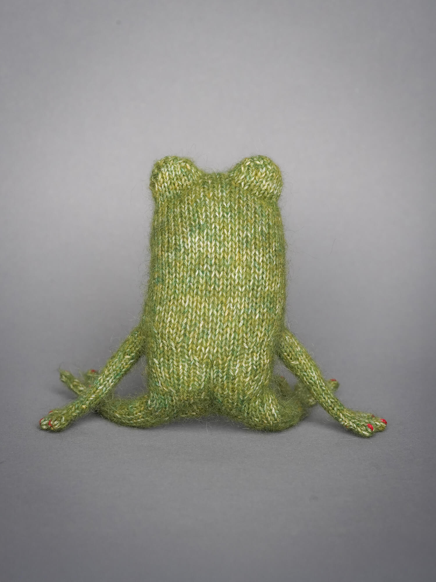 Вязаная лягушечка Мэрилин может сидеть с опорой на передние лапки.