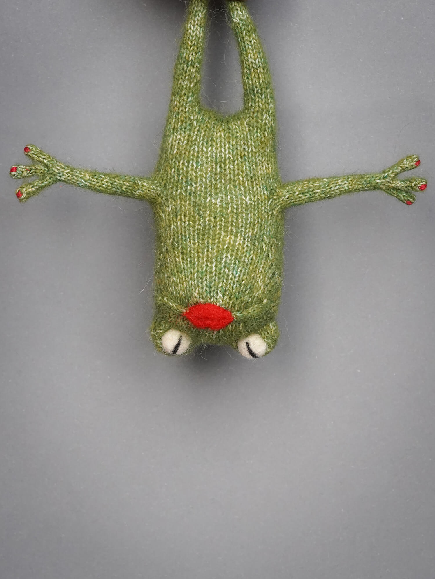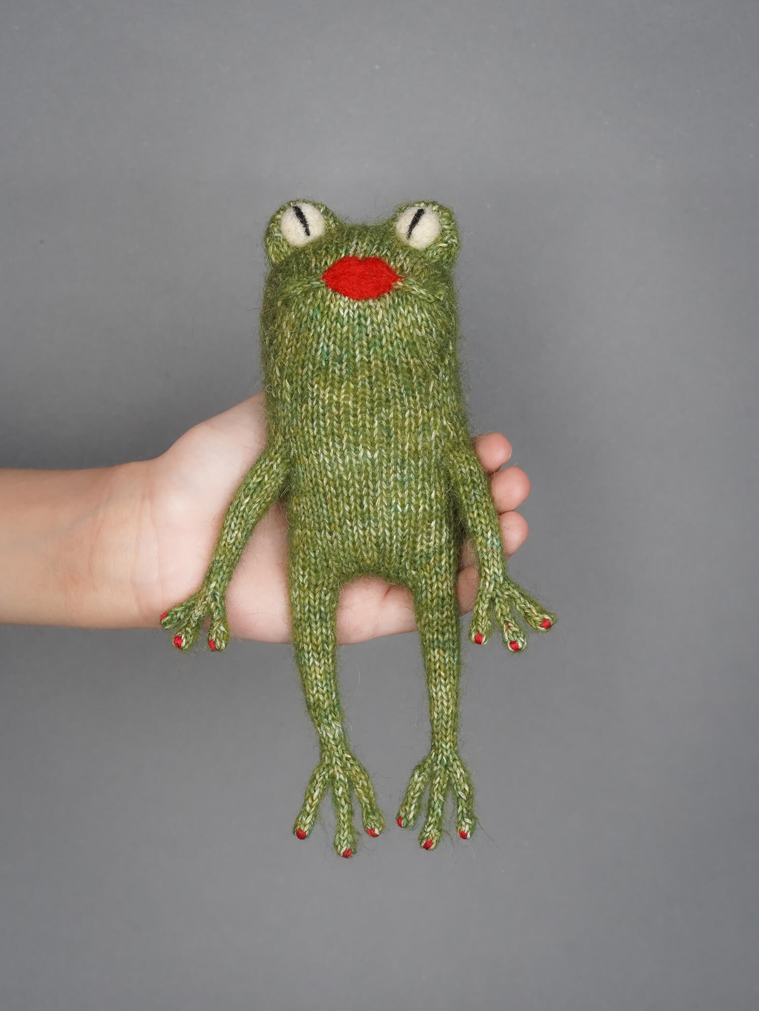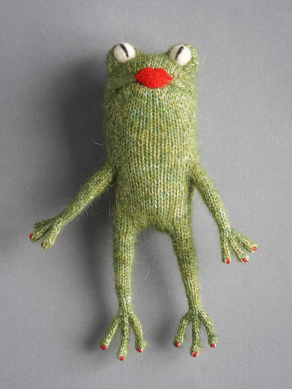 Вязаная лягушечка Мэрилин может сидеть с опорой на передние лапки.