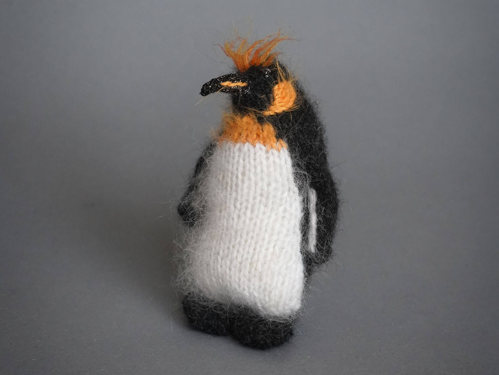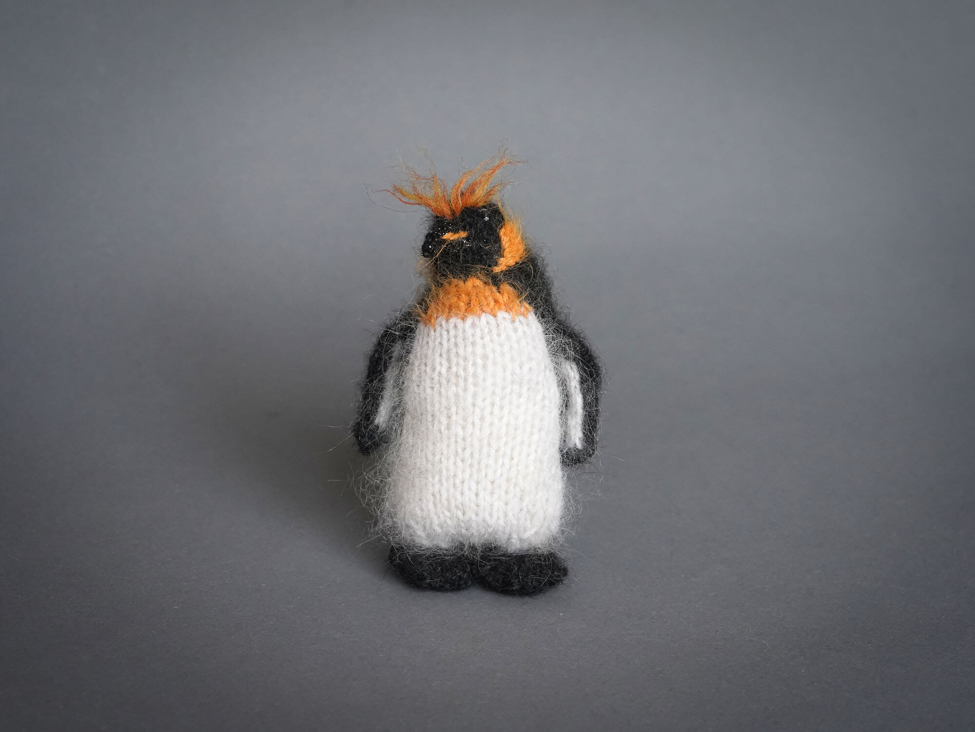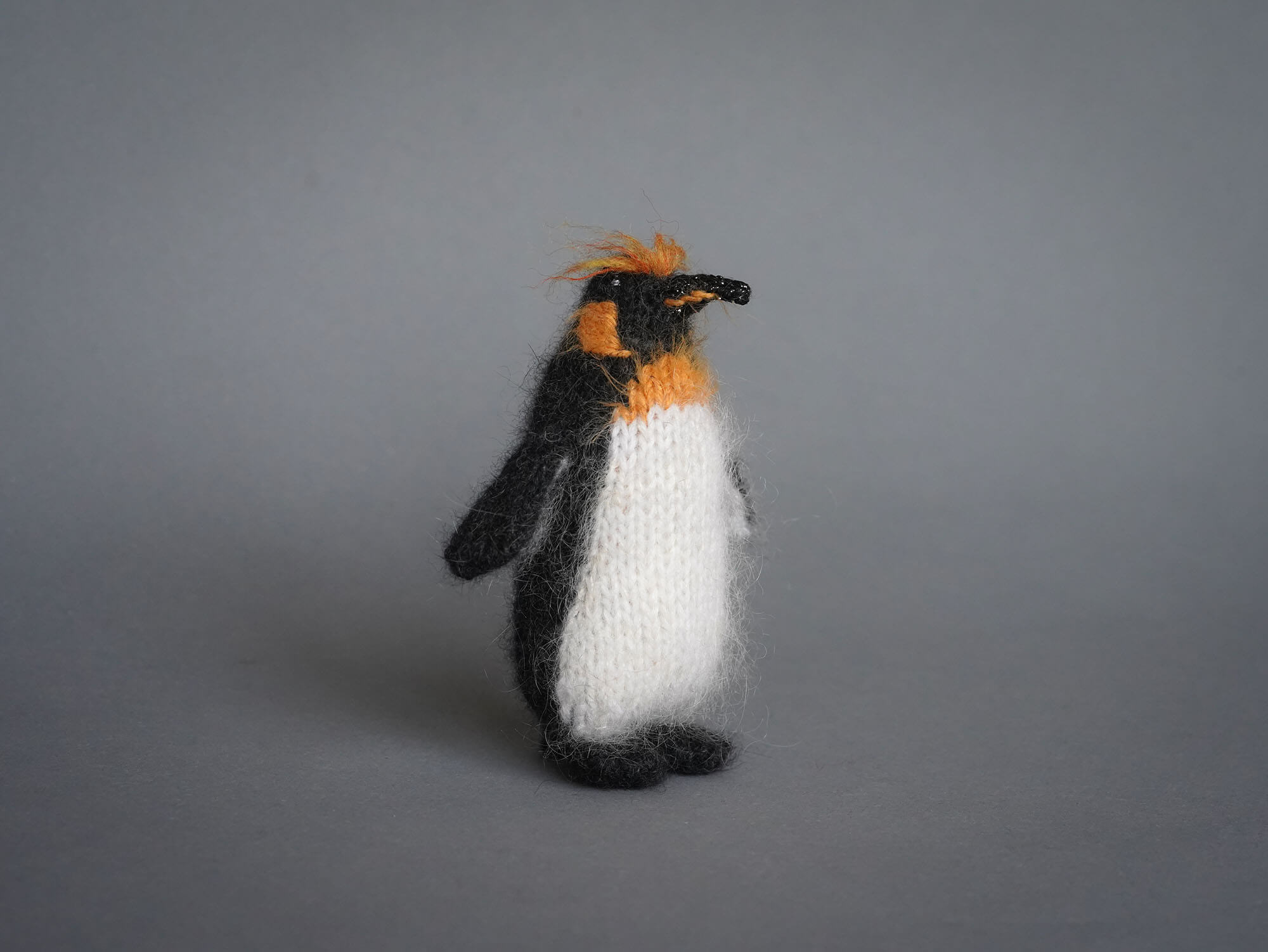 Knitted King penguin Sir Orangebrow can stand on its own: its tail, like a touch of quiet magic, helps it stay balanced.