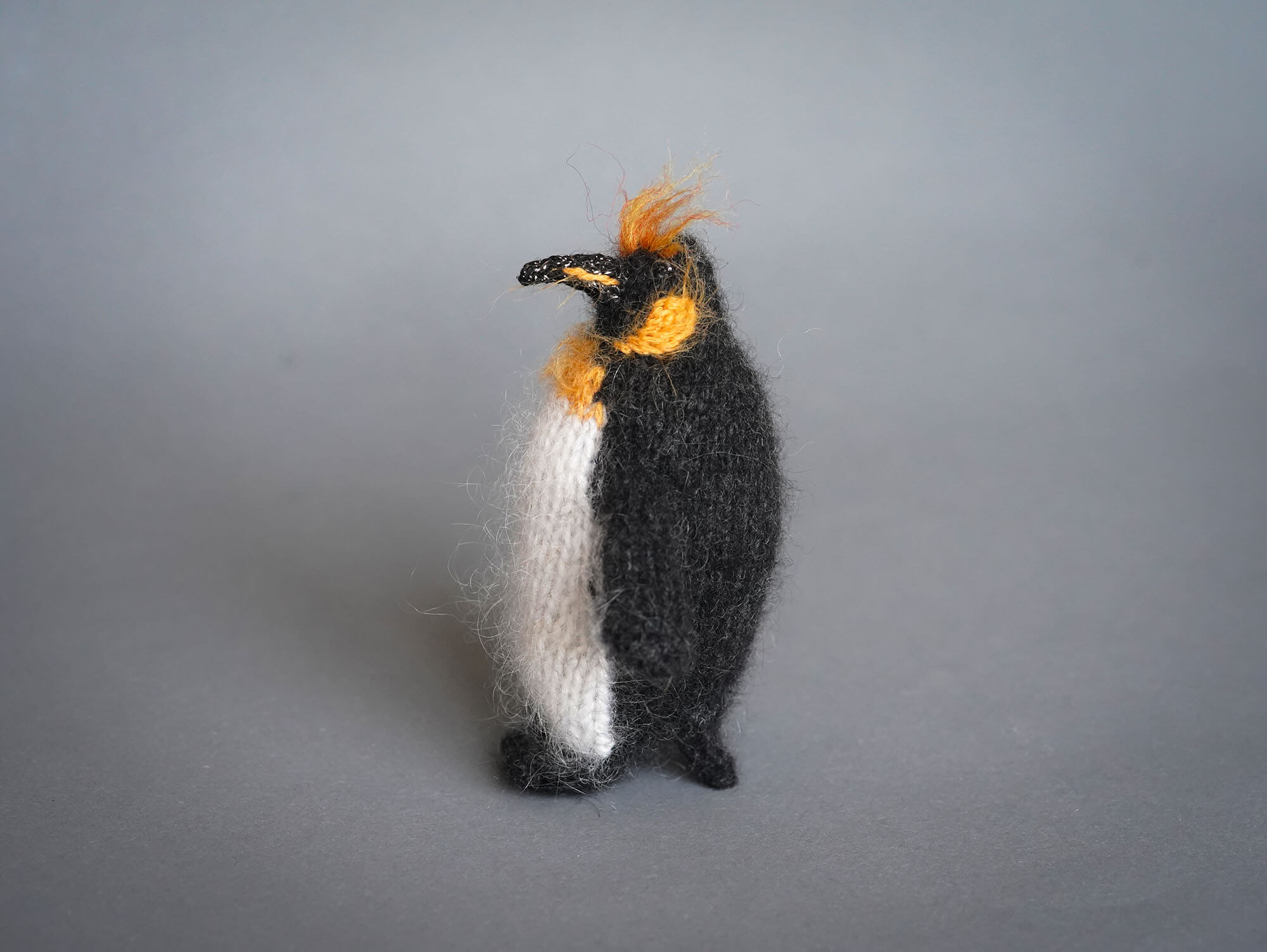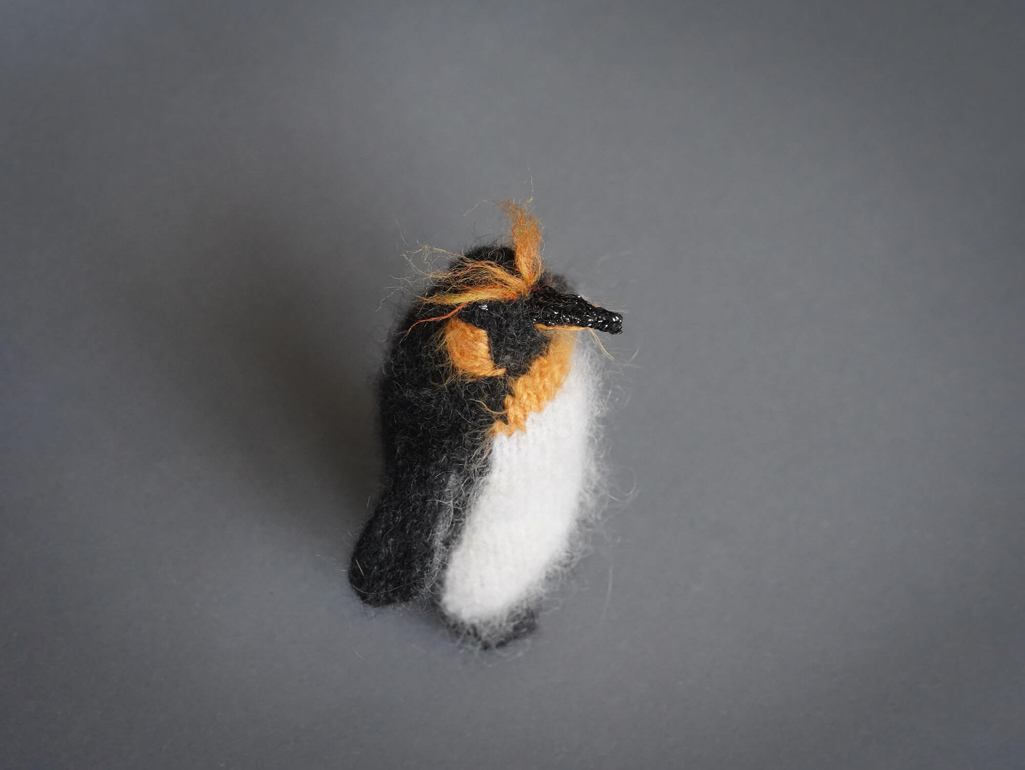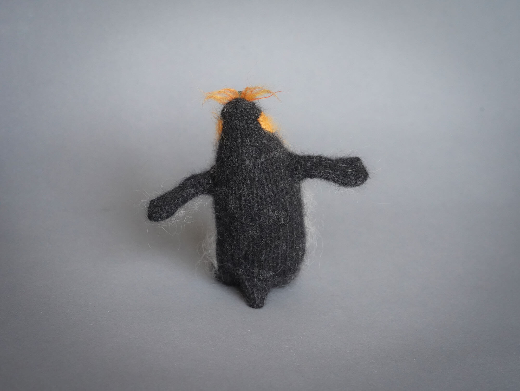 Knitted King penguin Sir Orangebrow can stand on its own: its tail, like a touch of quiet magic, helps it stay balanced.