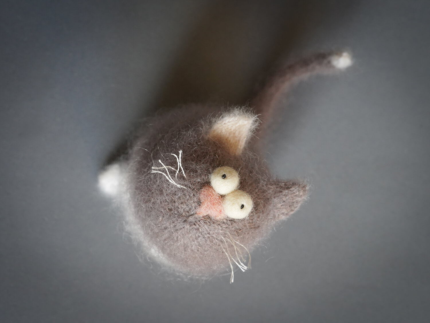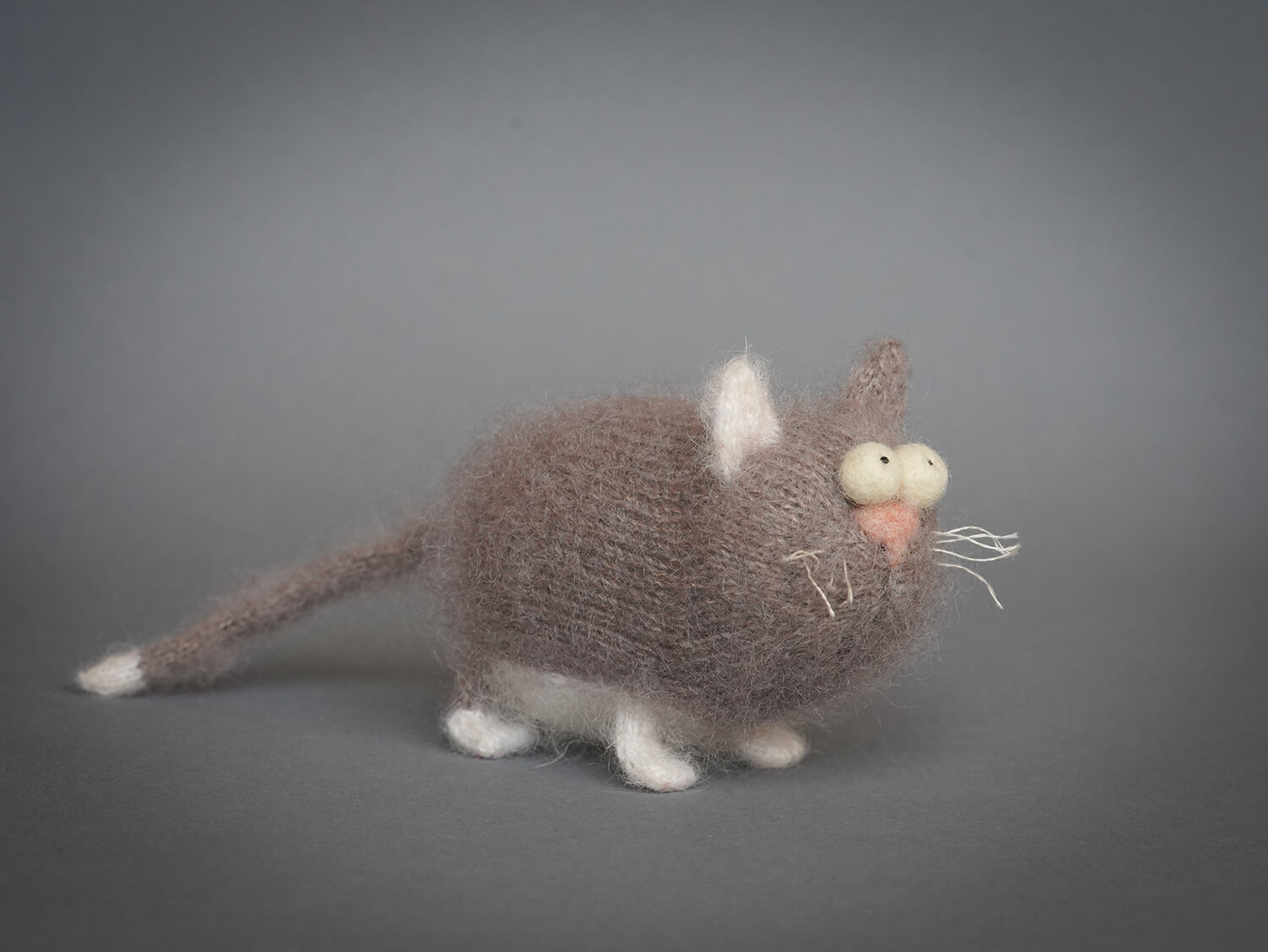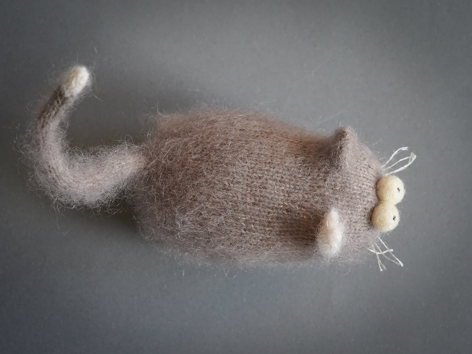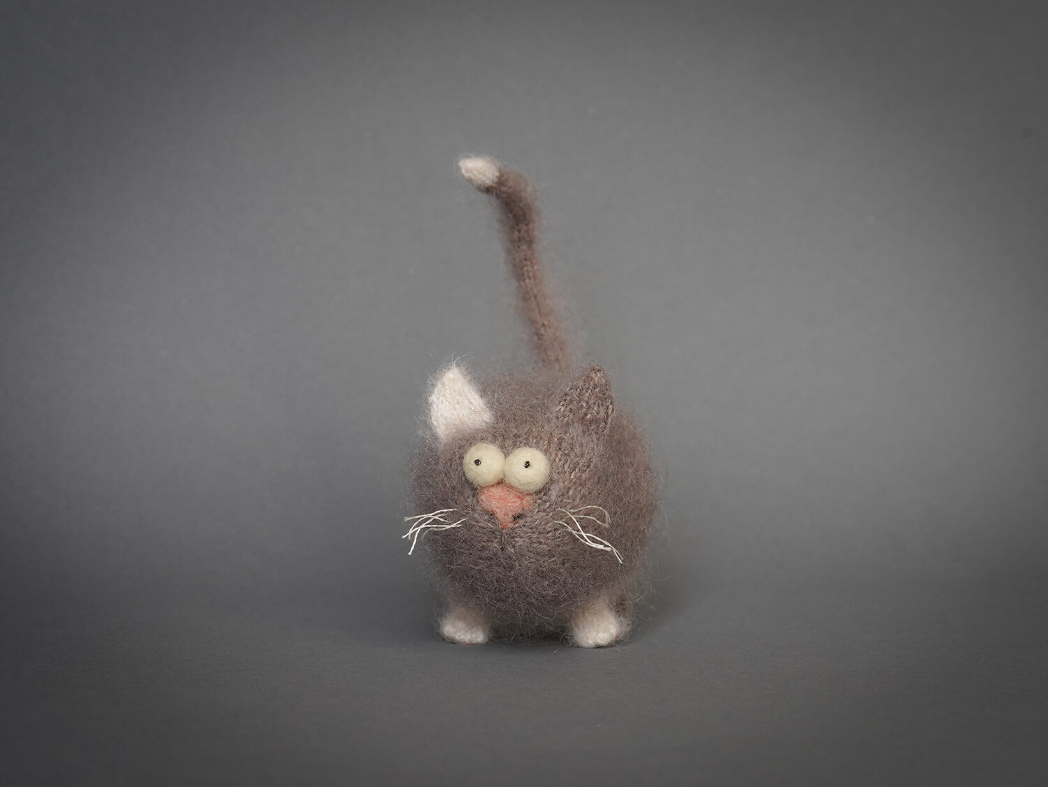 He is made using a mixed technique — knitted with needles and partially felted from wool.