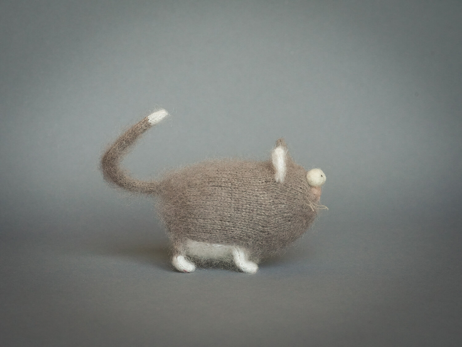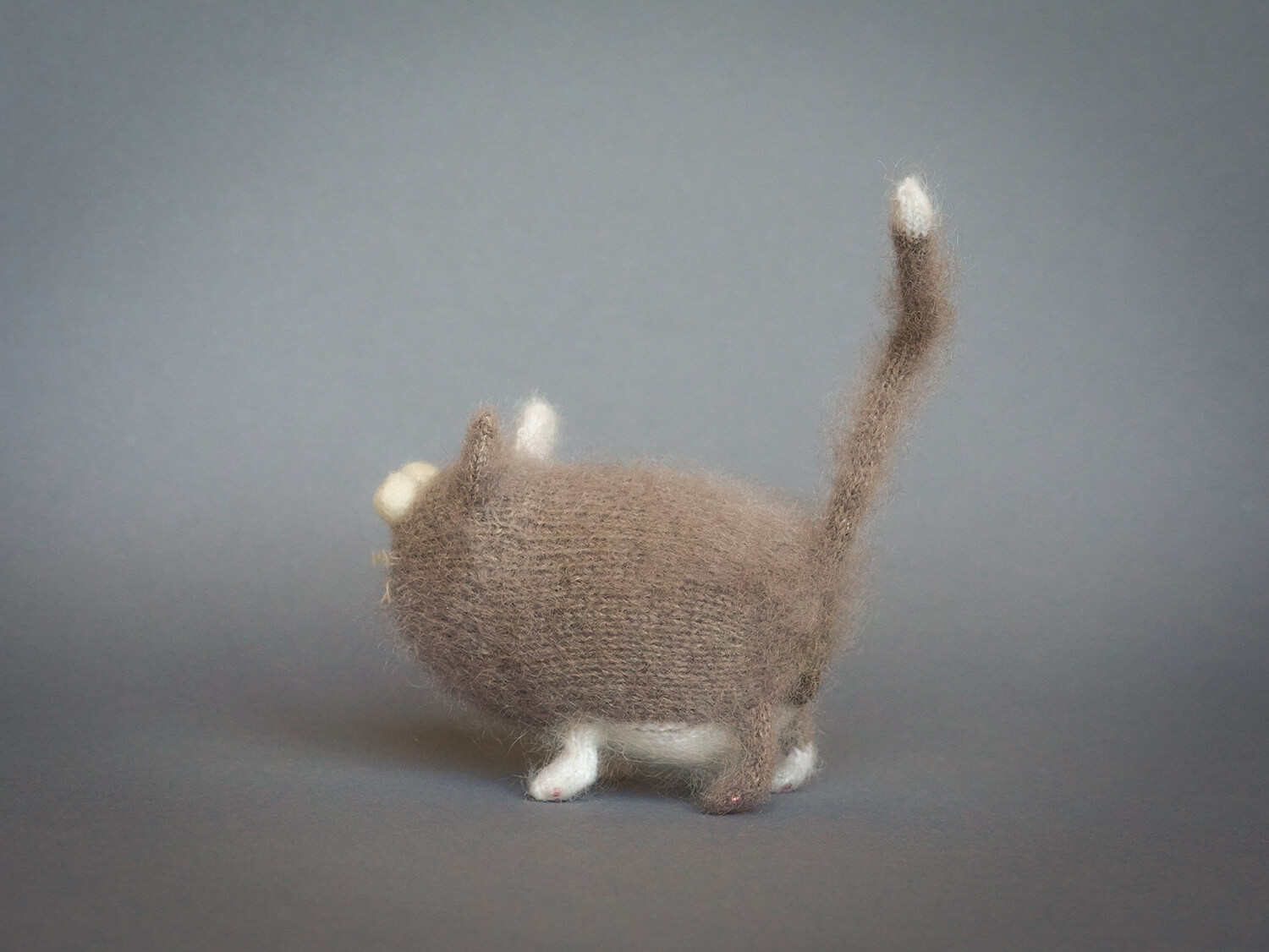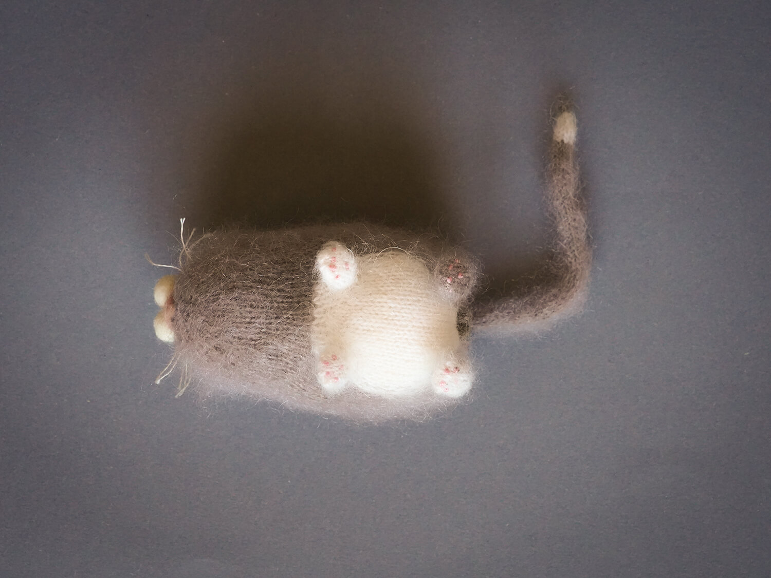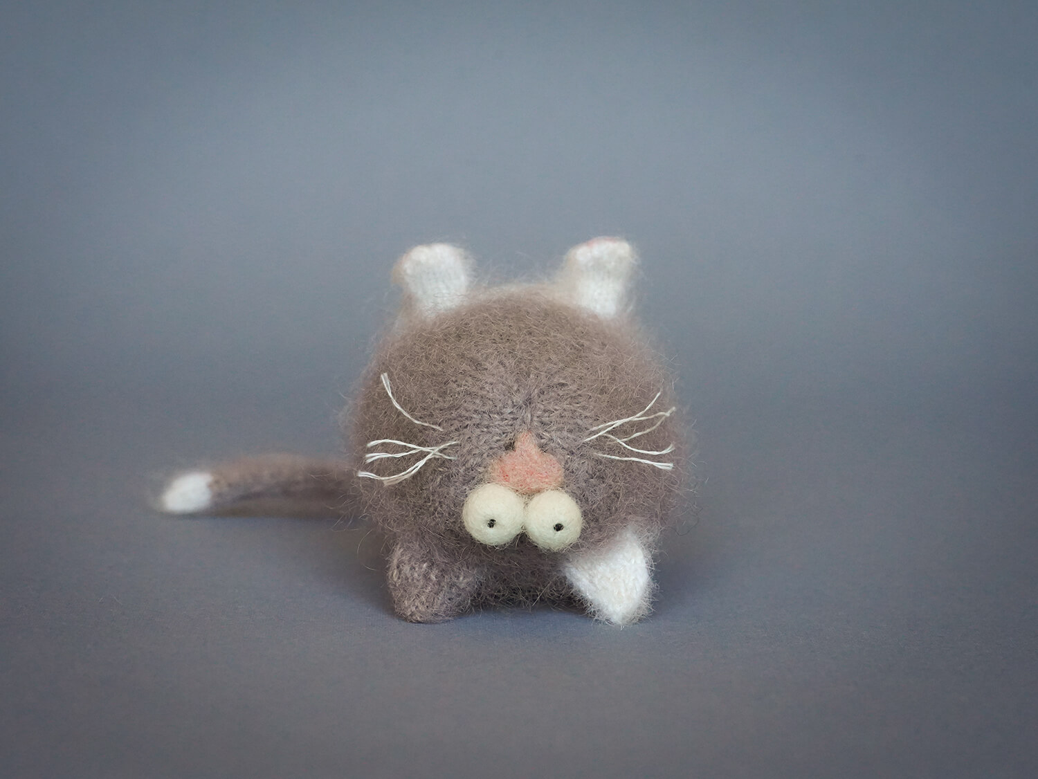 He is made using a mixed technique — knitted with needles and partially felted from wool.