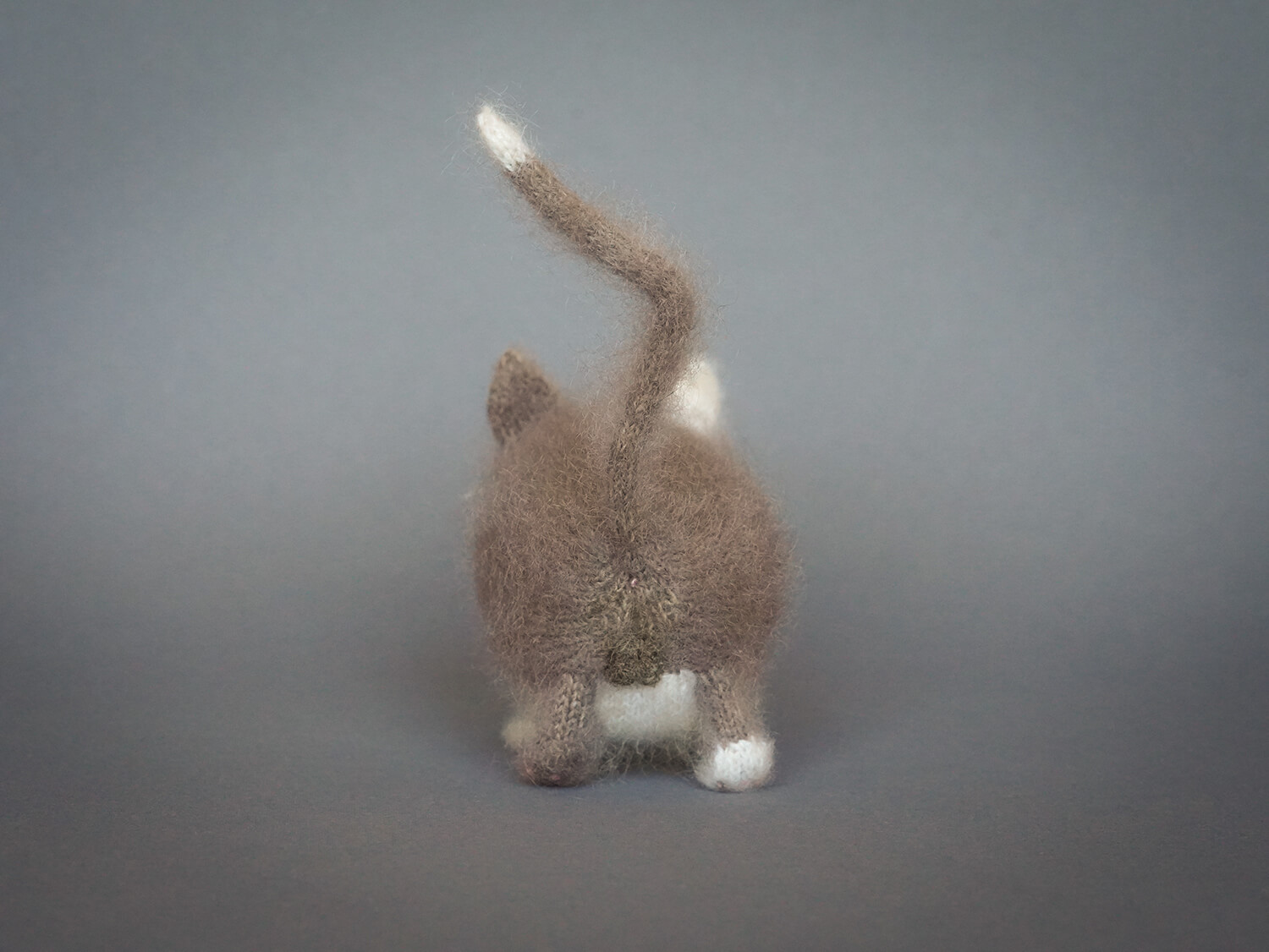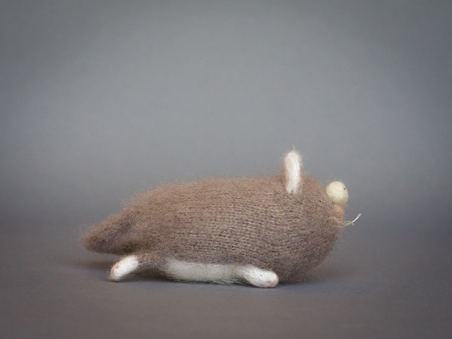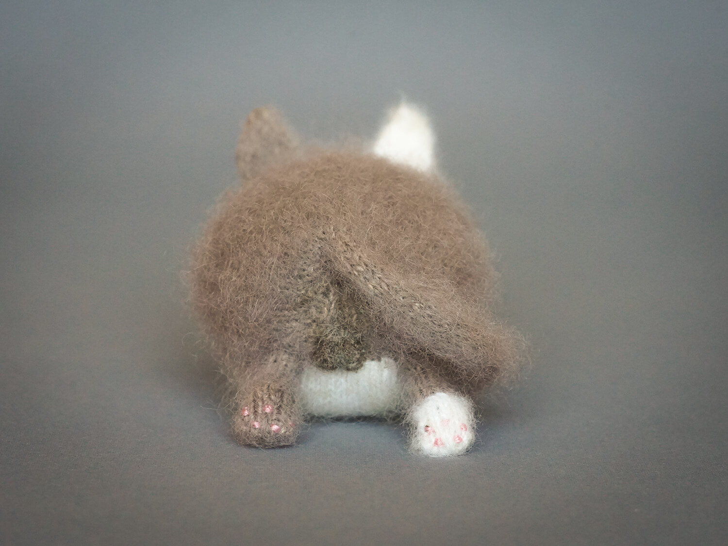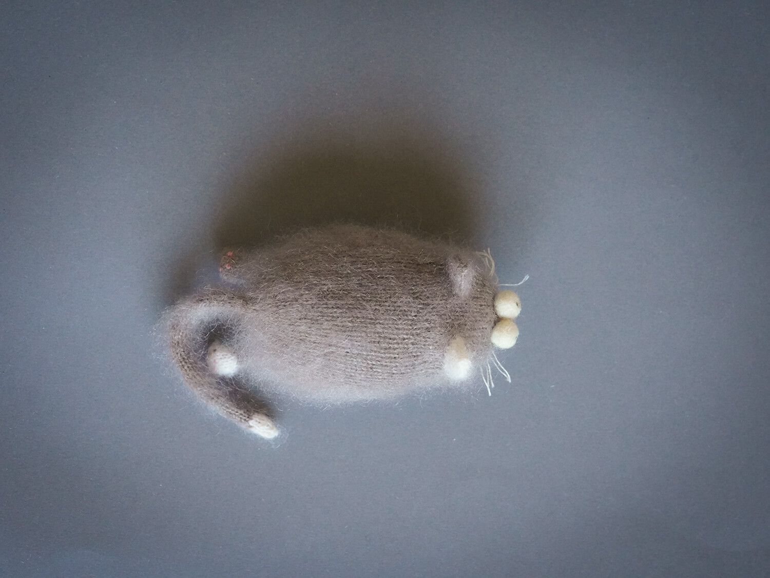 He is made using a mixed technique — knitted with needles and partially felted from wool.